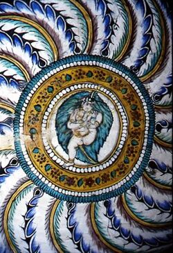 In Puranas and Vaishnava theology, māyā is described as one of the nine shaktis of Vishnu.[46] Māyā became associated with sleep; and Vishnu's māyā is sleep which envelopes the world when he awakes to destroy evil. Vishnu, like Indra, is the master of māyā; and māyā envelopes Vishnu's body.[46] The Bhagavata Purana narrates that the sage Markandeya requests Vishnu to experience his māyā. Vishnu appears as an infant floating on a fig leaf in a deluge and then swallows the sage, the sole survivor of the cosmic flood. The sage sees various worlds of the universe, gods etc. and his own hermitage in the infant's belly. Then the infant breathes out the sage, who tries to embrace the infant, but everything disappears and the sage realizes that he was in his hermitage the whole time and was given a flavor of Vishnu's māyā.[47] The magic creative power, Māyā was always a monopoly of the central Solar God; and was also associated with the early solar prototype of Vishnu in the early Aditya phase.[46]