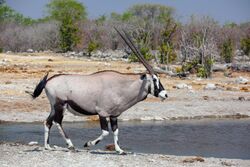 Some species, such as the gemsbok, sable antelope, and Grant's gazelle, are camouflaged with strongly disruptive facial markings that conceal the highly recognisable eye.[34] Many species, such as gazelles, may be made to look flat, and hence to blend into the background, by countershading.[35] The outlines of many bovids are broken up with bold disruptive colouration, the strongly contrasting patterns helping to delay recognition by predators.[36] However, all the Hippotraginae (including the gemsbok) have pale bodies and faces with conspicuous markings. The zoologist Tim Caro describes this as difficult to explain, but given that the species are diurnal, he suggests that the markings may function in communication. Strongly contrasting leg colouration is common only in the Bovidae, where for example Bos, Ovis, bontebok and gemsbok have white stockings. Again, communication is the likely function.[33]