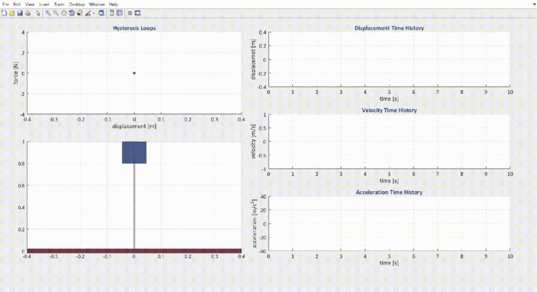 The following gif shows the nonlinear response of a single-degree-of-freedom (SDOF) mechanical system, with unit mass and asymmetric rate-independent hysteretic behavior, subjected to an external random force. To simulate its response, the following ABM parameters have been used: [math]\displaystyle{ k_a^+=50 \,\, (k_a^-=50), k_b^+=10 \,\, (k_b^-=1), f_0^+=1 \,\, (f_0^-=2) }[/math].