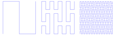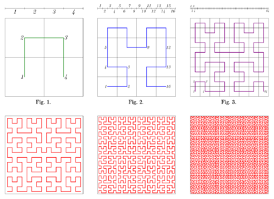 A year later, David Hilbert published in the same journal a variation of Peano's construction.[8] Hilbert's article was the first to include a picture helping to visualize the construction technique, essentially the same as illustrated here. The analytic form of the Hilbert curve, however, is more complicated than Peano's.