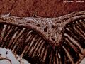 Microscopic cross-section of the rectum of a dog (400×), showing a high concentration of goblet cells in amongst the column-shaped lining. Goblet cells can be seen as the circular cells with a clear inner material (cytoplasm).