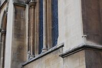 Protective glazing is one of the few ways conservators can attempt to preventively conserve stained glass in situ. While this practice can offer many benefits, as with most other treatments, it is not without drawbacks. Ideally, the installation of protective glazing can "relieve the stained glass of its function as a weather shield […], protect it against mechanical and atmospheric damage, and […] prevent condensation on the surface of the stained glass," thus minimising the need for interventive conservation (CVMA 2004). Unfortunately, in practice, this is not always the case, and it is well known that unsuitable, or improperly ventilated protective glazing can actually create an overly hot or humid microclimate around the historic glass that increases the rate of deterioration (Vogel et al. 2007, 13). Alternatively, protective screens or grills can be installed on the exterior of windows to prevent mechanical damage like vandalism, however, this can have a significant, negative impact on the aesthetic value of the windows from both the exterior and interior (figs. 4–5).