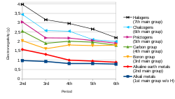 However, in group XIII (Boron Family), the electronegativity first decreases from boron to aluminium and then increases down the group. It is due to the fact that the atomic size increases as we move down the group, but at the same time the effective nuclear charge increases due to poor shielding of the inner d and f electrons. As a result, the force of attraction of the nucleus for the electrons increases and hence the electronegativity increases from aluminium to thallium.[13][14]