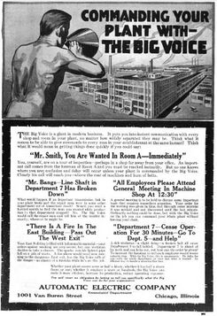 In 1910, the Automatic Electric Company of Chicago, Illinois, already a major supplier of automatic telephone switchboards, announced it had developed a loudspeaker, which it marketed under the name of the Automatic Enunciator. Company president Joseph Harris foresaw multiple potential uses, and the original publicity stressed the value of the invention as a hotel public address system, allowing people in all public rooms to hear announcements.[3] In June 1910, an initial "semi-public" demonstration was given to newspaper reporters at the Automatic Electric Company building, where a speaker's voice was transmitted to loudspeakers placed in a dozen locations "all over the building".[4]