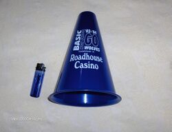 From the Ancient Greek era to the nineteenth century, before the invention of electric loudspeakers and amplifiers, megaphone cones were used by people speaking to a large audience, to make their voice project more to a large space or group. Megaphones are typically portable, usually hand-held, cone-shaped acoustic horns used to amplify a person’s voice or other sounds and direct it towards a given direction. The sound is introduced into the narrow end of the megaphone, by holding it up to the face and speaking into it. The sound projects out the wide end of the cone. The user can direct the sound by pointing the wide end of the cone in a specific direction. In the 2020s, cheerleading is one of the few fields where a nineteenth century-style cone is still used to project the voice. The device is also called “speaking-trumpet”, “bullhorn” or “loud hailer”.