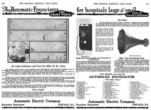 In 1913, multiple units were installed throughout the Comiskey Park baseball stadium in Chicago, both to make announcements and to provide musical interludes,[7] with Charles A. Comiskey quoted as saying: "The day of the megaphone man has passed at our park." The company also set up an experimental service, called the Musolaphone, that was used to transmitted news and entertainment programming to home and business subscribers in south-side Chicago,[8] but this effort was short-lived. The company continued to market the enunciators for making announcements in establishments such as hospitals, department stores, factories, and railroad stations, although the Automatic Enunciator Company was dissolved in 1926.[5]