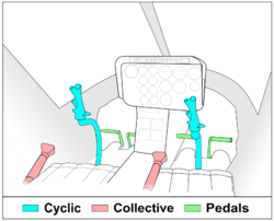A helicopter has four flight control inputs. These are the cyclic, the collective, the anti-torque pedals, and the throttle. The cyclic control is usually located between the pilot's legs and is commonly called the cyclic stick or just cyclic. On most helicopters, the cyclic is similar to a joystick. However, the Robinson R22 and Robinson R44 have a unique teetering bar cyclic control system and a few helicopters have a cyclic control that descends into the cockpit from overhead.[citation needed]