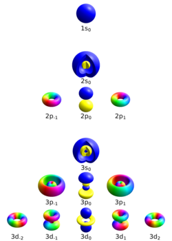 The value of ℓ ranges from 0 to n − 1, so the first p orbital (ℓ = 1) appears in the second electron shell (n = 2), the first d orbital (ℓ = 2) appears in the third shell (n = 3), and so on:[2]