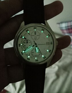 Ultimately, luminous paint dials started to use promethium and later tritium (an isotope of hydrogen with two neutrons) instead of radium due to the latter's long half-life, cost, and gamma emissions. Promethium and tritium emit only low-energy beta particles and are therefore only dangerous when ingested. However, what really changed the game were LEDs, which became commercially available in 1962 and made the original need for glow-in-the-dark paint completely irrelevant.[13] Today, almost no household glow-in-the-dark wristwatch dials or toys are made with radioactive substances at all; instead, they rely on slow phosphorescence, the absorption and slow re-emission of ordinary light, which is why they typically only glow for a few minutes after you turn the lights out.[14]