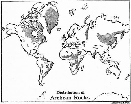 Distribution.—It is generally assumed that the Archean rocks underlie all the younger formations over the whole globe, and presumably this is the only system that does so. Naturally, the area of its outcrop is limited, for, directly or indirectly, all the younger rock groups must rest upon it.