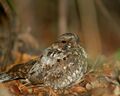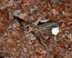 The Puerto Rican nightjar feeds on beetles, moths and other insects that it catches in flight.[1] It nests on the ground under closed canopies and needs an abundant leaf layer to hold the eggs.[3][7] The peak months for nesting activity are April–June.[7] The clutch is usually of 1-2 eggs, which are light brown with darker brown or purple patches.[3] The eggs have an incubation period of 18–20 days and are primarily incubated by the male.[3][6] The chicks are a cinnamon downy color[6] and they start to fly at about 14 days after hatching.[3] Like many ground-nesting birds, the nightjar will try to divert the attention of potential predators away from the nest by conspicuously flying away and vibrating its wings.[3] The species may be permanently territorial.[1]
