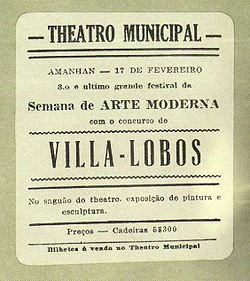 Most of the intellectuals and artists who represented Modernism in Brazil lived in Europe in the period after the World War I and, from this experience, absorbed ideas and techniques that resulted in Brazilian Modernism. Consequently, all the excitement that characterized the beginning of the 20th century in Europe arrived in Brazil as a moment of renewal and the search to produce a new model of art that was concerned with social issues. However, it wasn't a copy of European art, but rather its own authentic and original art. With the beginning of the Brazilian avant-garde and the return of artists to the country, the necessity of organizing events to disseminate new ideas became a concern for them. In this context, the Modern Art Week took place in 1922, scheduled to commemorate the centenary of independence. Considered a milestone of Modernism in the country and in Latin America, the event featured poetry recitals, musical concerts and opened doors to a new artistic language in relation to different types of art, such as painting, poetry and literature.[7][8]