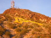 A letter has existed on the slope of the mountain since 1918. A "T" followed by an "N" were the first letters to grace the landmark. Tempe Butte, home to "A" Mountain, has had the "A" installed on the slope of its south face since 1938 and is visible from campus just to the south. The original "A" was destroyed by vandals in 1952 with pipe bombs and a new "A", constructed of reinforced concrete, was built in 1955.[209] The vandals were never identified but many speculate the conspirators were students from the rival in-state university (University of Arizona). Many ancient Hohokam petroglyphs were destroyed by the bomb; nevertheless, many of these archeological sites around the mountain remain. There are many traditions surrounding "A" Mountain, including a revived "guarding of the 'A'" in which students camp on the mountainside before games with rival schools.[209] "Whitewashing" of the "A" is a tradition in which incoming freshmen paint the letter white during orientation week and is repainted gold before the first football game of the season.[210] Whitewashing dates back to the 1930s and it grows in popularity every year, with thousands of students going up to paint the "A" every year.[211]