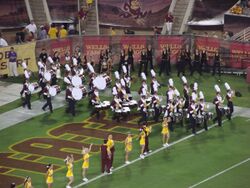 The Arizona State University Sun Devil Marching Band, created in 1915 and known as the "Pride of the Southwest", was the first of only two marching bands in the Pac-12 to receive the prestigious Sudler Trophy.[216] The John Philip Sousa Foundation awarded the band the trophy in 1991. The Sun Devil Marching Band remains one of only 28 bands in the nation to have earned the designation. The band performs at every football game played in Sun Devil Stadium. In addition, the Sun Devil Marching Band has made appearances in the Fiesta Bowl, the Rose Bowl, the Holiday Bowl, and the Super Bowl XLII, in addition to many others.[216] Smaller ensembles of band members perform at other sport venues including basketball games at Wells Fargo Arena and baseball games. The Devil Walk is held in Wells Fargo Arena by the football team and involves a more formal introduction of the players to the community; a new approach to the tradition added in 2012 with the arrival of head coach Todd Graham.[217] It begins 2 hours and 15 minutes prior to the game and allows the players to establish rapport with the fans. The walk ends as the team passes the band and fans lined along the path to Sun Devil Stadium. The walk was discontinued when Graham was fired. However, in 2022, interim coach Shaun Aguano announced that the Sun Devil Walk is returning.[218][219] The most recognizable songs played by the band are "Alma Mater" and ASU's fight songs titled "Maroon and Gold" and the "Al Davis Fight Song". "Alma Mater" was composed by former Music Professor and Director of Sun Devil Marching Band (then known as Bulldog Marching Band), Miles A. Dresskell, in 1937.[220] "Maroon and Gold" was authored by former Director of Sun Devil Marching Band, Felix E. McKernan, in 1948. The "Al Davis Fight Song" (also known as "Go, Go Sun Devils" and "Arizona State University Fight Song") was composed by ASU alumnus Albert Oliver Davis in the 1940s without any lyrics. Recently lyrics were added to the song.[216]