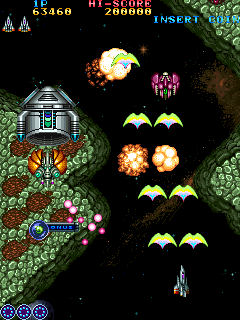 There are four items for the players to pick up: One increases player's shot strength, one increases their bomb stock, one would grant the player various points and the other would grant the player a 1UP.[4][6] Extends are awarded with every 70,000 points. The game hosts a number of hidden bonus secrets to be found, which is crucial for reaching high-scores to obtain extra lives. Getting hit by enemy fire or colliding against solid stage obstacles will result in losing a live and once all lives are lost, the game is over unless the players insert more credits into the arcade machine to continue playing. Although there is an ending, the game loops back to the first stage after completing the last stage as with previous titles from Toaplan, with each one increasing the difficulty and enemies being more durable, firing denser bullet patterns and Circle Bomb icons appearing less frequently.
