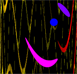 [math]\displaystyle{ [x,y] }[/math] passed through the logistic map. The first iterate (blue) is the initial condition, which essentially forms a circle. Animation shows the first to the sixth iteration of the circular initial conditions. It can be seen that