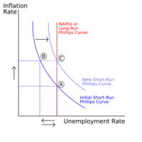 To understand this concept, start with the actual unemployment equal to the NAIRU. Then, assume that a country's government and its central bank use demand-side policy to reduce the unemployment rate and then attempt to keep the rate at a specific low level: rising budget deficits or falling interest rates increase aggregate demand and raise employment of labor. Thus, the actual unemployment rate falls, as going from point A to B in the nearby graph. Unemployment then stays below the NAIRU for years or more, as at point B. In this situation, the theory behind the NAIRU posits that inflation will accelerate, i.e. get worse and worse (in the absence of wage and price controls). As the short-run Phillips curve theory indicates, higher inflation rate results from low unemployment. That is, in terms of the "trade-off" theory, low unemployment can be "bought," paid for by suffering from higher inflation. But the NAIRU theory says that this is not the whole story, so that the trade-off breaks down: a persistently higher inflation rate is eventually incorporated as higher inflationary expectations. Then, if workers and employers expect higher inflation, it results in higher inflation, as higher money wages are passed on to consumers as higher prices. This causes the short run Phillips curve to shift to the right and upward, worsening the trade-off between inflation and unemployment. At a given unemployment rate, inflation accelerates. But if the unemployment rate rises to equal the NAIRU, we see higher inflation than before the expansionary policies, as at point C in the nearby diagram. The fall of the unemployment rate was temporary because it could not be sustained. In sum, the trade-off between inflation and unemployment cannot be relied upon to be stable: taking advantage of it causes it to disappear. This story fits the experience of the United States during the late 1960s, during which unemployment rates stayed low (below 4% of the civilian labor force) and inflation rates rose significantly.