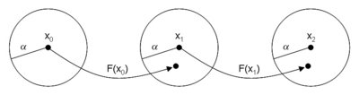 Definition: A sequence \(\{x_i\}_{i=a}^b\) is an \(\alpha\)-pseudo-orbit for \(f\) if \(d(x_{i+1},f(x_i))<\alpha\) for all \(a \leq i \leq b\ .\) See Figure 1.