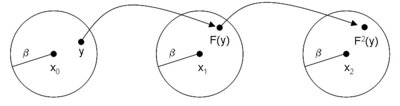 Definition: The point \(y\) \(\beta\)-shadows \(\{x_i\}_{i=a}^b\) if \(d(f^i(y),x_i)|<\beta\) for \(a \leq i \leq b\ .\) See Figure 2.