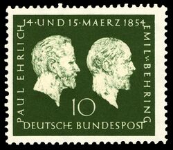 West Germany issued a postage stamp in 1954 on the 100th anniversary of the births of Paul Ehrlich (14 March 1854) and Emil von Behring (15 March 1854).