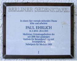 In 1908, he received the Nobel Prize in Physiology or Medicine for his contributions to immunology.[2] He was the founder and first director of what is now known as the Paul Ehrlich Institute, a German research institution and medical regulatory body that is the nation's federal institute for vaccines and biomedicines. A genus of Rickettsiales bacteria, Ehrlichia, is named after him.[3]