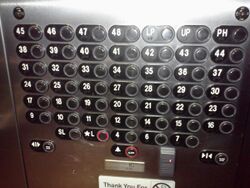 In modern signage, at least in North America, a five-pointed star (★) additionally appears beside the button for the main entry floor. In the United States , the five-pointed-star marking is mandated by Title III of the Americans with Disabilities Act (ADA), as described in Section 4.10.12(2) of the ADA Accessibility Guidelines for Buildings and Facilities (ADAAG).[26] However this may be used to simply indicate a way out, such as to indicate a sky lobby. As an example, the residential elevators at the John Hancock Center all have their main floors labeled as the 44th as in order to get from a residential floor to the ground one would need to take two elevators: one from the residences to the sky lobby, and the other from the sky lobby to the ground. In the event more than one floor could be considered main floor, such as when a building has exits on more than one floor, a relatively common solution is to simply have no star and have other indications to indicate a main floor. A less commonly used solution has more than one star.