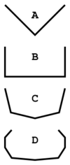 It is possible to refer to the different hulls by the numbers of the flat panels that make up the boat. Thus A is a two-panel boat, B is a three-panel boat, C is a four-panel boat and D is an eight-panel boat.