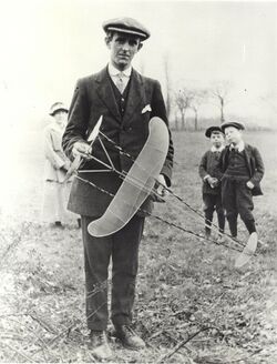 In the United Kingdom, models built to plans or kits published before January 1951 are categorised as vintage and those subsequently but prior to 1960 are categorised as classic. Jim Arnott holds Winding Boy, a classic rubber model designed by Urlan Wannop.