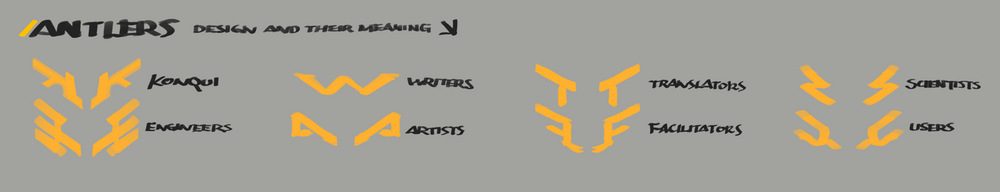 Other dragons with different colors and professions were added to Konqi as part of the Tyson Tan redesign concept. Each dragon has a pair of letter-shaped antlers that reflect their role in the KDE community.