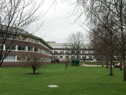 There are five halls of residence on the main campus: Horwood, Lindsay, Barnes, Holly Cross and The Oaks. (Hawthorns Hall was located off site in Keele village just outside the main entrance. However, the site has been sold for redevelopment, and the halls demolished.) These halls provide accommodation for 70% of all full-time students.[52] Three of the oldest halls, Horwood (1957), Lindsay (1964) and Barnes (1970) are named after the founding fathers of the university.[53] The Oaks (1992), west of Lindsay Hall, is named after four oak trees that were felled to pave the way for the university residence and Holly Cross (1993).[54] The Hawthorns (1957), remnants of the Sneyd property in Keele Village, was originally a large house, two paddocks and gardens totalling 13 acres.[55]