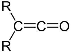 In organic chemistry, a ketene is an organic compound of the form RR'C=C=O, where R and R' are two arbitrary monovalent chemical groups (or two separate substitution sites in the same molecule).[1] The name may also refer to the specific compound ethenone H