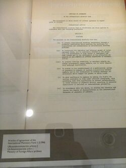 The International Monetary Fund (IMF) is a major financial agency of the United Nations , and an international financial institution funded by 190 member countries, with headquarters in Washington, D.C. It is regarded as the global lender of last resort to national governments, and a leading supporter of exchange-rate stability. Its stated mission is "working to foster global monetary cooperation, secure financial stability, facilitate international trade, promote high employment and sustainable economic growth, and reduce poverty around the world."[1][9] Established on December 27, 1945[10] at the Bretton Woods Conference, primarily according to the ideas of Harry Dexter White and John Maynard Keynes, it started with 29 member countries and the goal of reconstructing the international monetary system after World War II. It now plays a central role in the management of balance of payments difficulties and international financial crises.[11] Through a quota system, countries contribute funds to a pool from which countries can borrow if they experience balance of payments problems. (As of 2016), the fund had SDR 477 billion (about US$667 billion).[10]