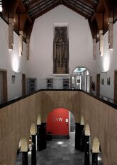 At the bottom of the hill lies the former convent of the Bonnefanten, now the university's Student Service Center, as well as a visitor center, including a gift shop. This building, which dates back to 1627, served as a convent for nuns originally from Liège who were referred to as "bons enfants", "good children". In the twentieth century, the city's art museum was established here and later took its name from the building, Bonnefantenmuseum. In 1979 the building became the main branch of the university library, until the library moved to its current location. The oldest part of the library building at Grote Looiersstraat was constructed in 1755 and served as the city's poor house and military hospital. In the 1970s, the city's public library was built in the garden. In 1999 the city library moved to its current location at Centre Ceramique. The old library was then acquired by the UM. After major renovation and expansion works, the university library relocated here in 2003.