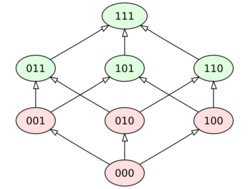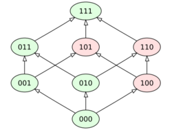 Hasse diagram of the monotonic function "at least two of a, b, c hold". Colors indicate function output values. |