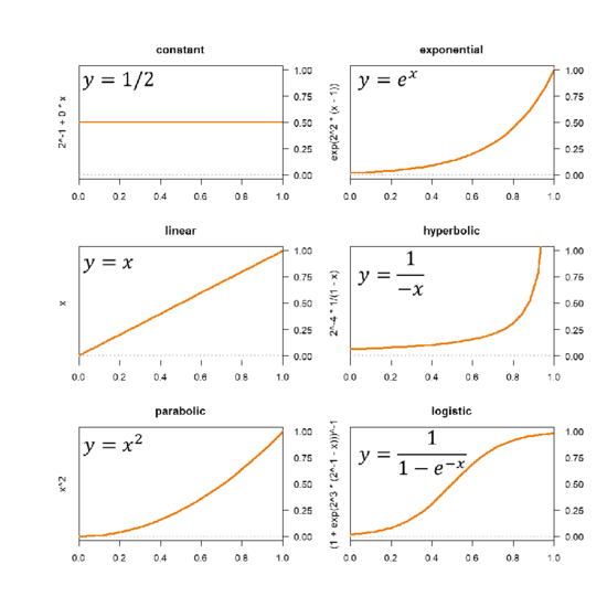 The graphic shows six monotonic functions. Their simplest forms are shown in the plot area and the expressions used to create them are shown on the y-axis.