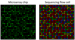 | Dynamic range | 100,000:1 (limited by sequence coverage)[28] | 1,000:1 (limited by fluorescence saturation)[28] |