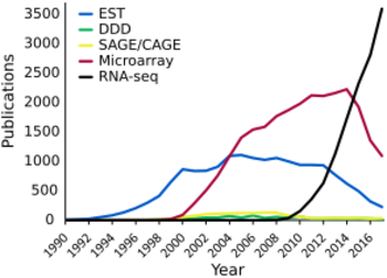 RNA-Seq may be used to identify genes within a genome, or identify which genes are active at a particular point in time, and read counts can be used to accurately model the relative gene expression level. RNA-Seq methodology has constantly improved, primarily through the development of DNA sequencing technologies to increase throughput, accuracy, and read length.[61] Since the first descriptions in 2006 and 2008,[40][62] RNA-Seq has been rapidly adopted and overtook microarrays as the dominant transcriptomics technique in 2015.[63]