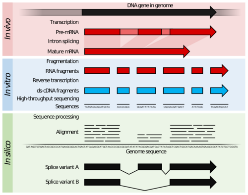 RNA-Seq refers to the combination of a high-throughput sequencing methodology with computational methods to capture and quantify transcripts present in an RNA extract.[10] The nucleotide sequences generated are typically around 100 bp in length, but can range from 30 bp to over 10,000 bp depending on the sequencing method used. RNA-Seq leverages deep sampling of the transcriptome with many short fragments from a transcriptome to allow computational reconstruction of the original RNA transcript by aligning reads to a reference genome or to each other (de novo assembly).[9] Both low-abundance and high-abundance RNAs can be quantified in an RNA-Seq experiment (dynamic range of 5 orders of magnitude)—a key advantage over microarray transcriptomes. In addition, input RNA amounts are much lower for RNA-Seq (nanogram quantity) compared to microarrays (microgram quantity), which allow examination of the transcriptome even at a single-cell resolution when combined with amplification of cDNA.[25][60] Theoretically, there is no upper limit of quantification in RNA-Seq, and background noise is very low for 100 bp reads in non-repetitive regions.[10]