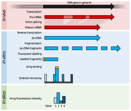 The dominant contemporary techniques, microarrays and RNA-Seq, were developed in the mid-1990s and 2000s.[9][33] Microarrays that measure the abundances of a defined set of transcripts via their hybridisation to an array of complementary probes were first published in 1995.[34][35] Microarray technology allowed the assay of thousands of transcripts simultaneously and at a greatly reduced cost per gene and labour saving.[36] Both spotted oligonucleotide arrays and Affymetrix high-density arrays were the method of choice for transcriptional profiling until the late 2000s.[12][33] Over this period, a range of microarrays were produced to cover known genes in model or economically important organisms. Advances in design and manufacture of arrays improved the specificity of probes and allowed more genes to be tested on a single array. Advances in fluorescence detection increased the sensitivity and measurement accuracy for low abundance transcripts.[35][37]