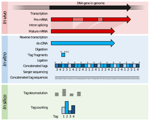 Serial analysis of gene expression (SAGE) was a development of EST methodology to increase the throughput of the tags generated and allow some quantitation of transcript abundance.[21] cDNA is generated from the RNA but is then digested into 11 bp "tag" fragments using restriction enzymes that cut DNA at a specific sequence, and 11 base pairs along from that sequence. These cDNA tags are then joined head-to-tail into long strands (>500 bp) and sequenced using low-throughput, but long read-length methods such as Sanger sequencing. The sequences are then divided back into their original 11 bp tags using computer software in a process called deconvolution.[21] If a high-quality reference genome is available, these tags may be matched to their corresponding gene in the genome. If a reference genome is unavailable, the tags can be directly used as diagnostic markers if found to be differentially expressed in a disease state.[21]