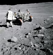 Backgrounds were not identical, just similar. What appear as nearby hills in some photos are actually mountains many miles away. On Earth, objects that are further away will appear fainter and less detailed. On the Moon, there is no atmosphere or haze to obscure faraway objects, thus they appear clearer and nearer.[70] Furthermore, there are very few objects (such as trees) to help judge distance. One such case is debunked in "Who Mourns For Apollo?" by Mike Bara.[71]