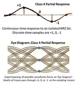 PR4 is characterized by an equalization target (+1, 0, -1) in bit-response sample values or (1-D)(1+D) in polynomial notation (here, D is the delay operator referring to a one sample delay). The target (+1, +1, -1, -1) or (1-D)(1+D)^2 is called Extended PRML (or EPRML). The entire family, (1-D)(1+D)^n, was investigated by Thapar and Patel.[29] The targets with larger n value tend to be more suited to channels with poor high-frequency response. This series of targets all have integer sample values and form an open eye-pattern (e.g. PR4 forms a ternary eye). In general, however, the target can just as readily have non-integer values. The classical approach to maximum-likelihood detection on a channel with intersymbol interference (ISI) is to equalize to a minimum-phase, whitened, matched-filter target.[30] The complexity of the subsequent Viterbi detector increases exponentially with the target length - the number of states doubling for each 1-sample increase in target length.