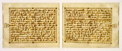 The term Codex Mashhad refers to an old codex of the Qurʾān, now mostly preserved in two manuscripts, MSS 18 and 4116, in the Āstān-i Quds Library, Mashhad, Iran. The first manuscript in 122 folios and the second in 129 folios together constitute more than 90% of the text of the Qurʾān, and it is also likely that other fragments will be found in Mashhad or elsewhere in the world.[31] The current Codex is in two separate volumes, MSS 18 and 4116. The former contains the first half of the Qurʾān, from the beginning to the end of the 18th sūra, al-Kahf, while the latter comprises the second half, from the middle of the 20th sūra, Ṭāhā, to the end of the Qurʾān.[32] In their present form, both parts of Codex Mashhad have been repaired, partially completed with pieces from later Kufic Qurʾāns and sometimes in a present-day nashkī hand.[33]