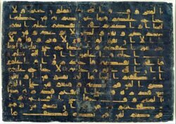 The Blue Qur'an (Arabic: المصحف الأزرق al-Muṣḥaf al-′Azraq) is a late 9th to early 10th-century Tunisian Qur'an manuscript in Kufic calligraphy, probably created in North Africa for the Great Mosque of Kairouan.[36] It is among the most famous works of Islamic calligraphy,[36] and has been called "one of the most extraordinary luxury manuscripts ever created."[37] Because the manuscript was done in Kufic style writing, it is quite hard to read. "The letters have been manipulated to make each line the same length, and the marks necessary to distinguish between letters have been omitted."[38] The Blue Quran is constructed of indigo-dyed parchment with the inscriptions done in gold ink, which makes it one of the rarest Quran productions ever known.[38] The use of dyed parchment and gold ink is said to have been inspired by the Christian Byzantine Empire, due to the fact that many manuscripts were produced in the same way there.[38] Each verse is separated by circular silver marks, although they are now harder to see due to fading and oxidization.[38]