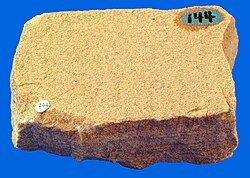 The Coconino Sandstone consists predominately of buff to white, well-sorted, uniformly fine grained 0.0045–0.98 in (0.11–24.89 mm), nearly pure quartz sand held together by siliceous cement. It contains a few scattered potassium feldspar grains and traces of heavy minerals. Many of the sand grains are frosted or pitted and nearly all of them are rounded to subangular. Typically, iron oxide staining and cements are commonly absent, which is reflect in its pale, white to buff color. However, locally, the Coconino Sandstone is iron-stained and, as a result, is either a brownish color, as in Marble Canyon, or bright red, as near Flagstaff, Arizona.[10][11]