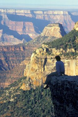 This rock formation is particularly prominent in the Grand Canyon, where it is visible as a prominent white cliff-forming layer. The thickness of the formation varies due to regional structural features; in the Grand Canyon area it is only 65 feet (20 m) thick in the west, thickens to over 600 feet (180 m) in the middle and then thins to 57 feet (17 m) in the east. Either the Kaibab Limestone or Toroweap Formation overlies the Coconino Sandstone. The Coconino Sandstone is typically buff to white in color. It consists primarily of fine well-sorted quartz grains, with minor amounts of potassium feldspar grains deposited by eolian processes (wind-deposited) approximately 275 million years ago. Several structural features such as ripple marks, sand dune deposits, rain patches, slump marks, and fossil tracks are not only well preserved within the formation, but also contribute evidence of its eolian origin.[3][4][5]