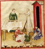 Flax was cultivated extensively in ancient Egypt, where the temple walls had paintings of flowering flax, and mummies were embalmed using linen.[13] Egyptian priests wore only linen, as flax was considered a symbol of purity.[14] Phoenicians traded Egyptian linen throughout the Mediterranean and the Romans used it for their sails.[15] As the Roman Empire declined, so did flax production. But with laws designed to publicize the hygiene of linen textiles and the health of linseed oil, Charlemagne revived the crop in the eighth century CE.[16] Eventually, Flanders became the major center of the European linen industry in the Middle Ages.[16] In North America, colonists introduced flax, and it flourished there,[12] but by the early 20th century, cheap cotton and rising farm wages had caused production of flax to become concentrated in northern Russia, which came to provide 90% of the world's output. Since then, flax has lost its importance as a commercial crop, due to the easy availability of more durable fibres.[17]