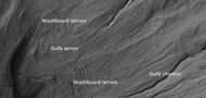 Close view of crater labeled with "washboard terrain" and other features, as seen by HiRISE Note: this is an enlargement of a previous image. The washboard terrain was formed before the gully apron since the gully apron cuts across the washboard terrain.[36]
