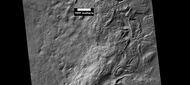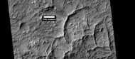 CTX image of the next image showing a wide view of the area. Since the hill is isolated it would be difficult for an aquifer to develop. Rectangle shows the approximate location of the next image.
