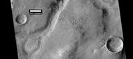 Gullies. Notice how channels curve around obstacles, as seen by HiRISE.